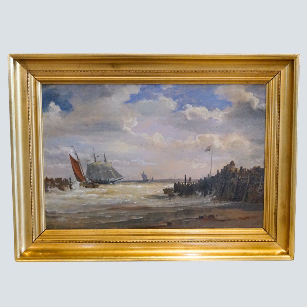 Mariner maleri af Carl Frederik Sørensen, motiv fra Holland 1853. Olie på lærred. Signeret "C. F. Sørensen 1853"Med guldramme.