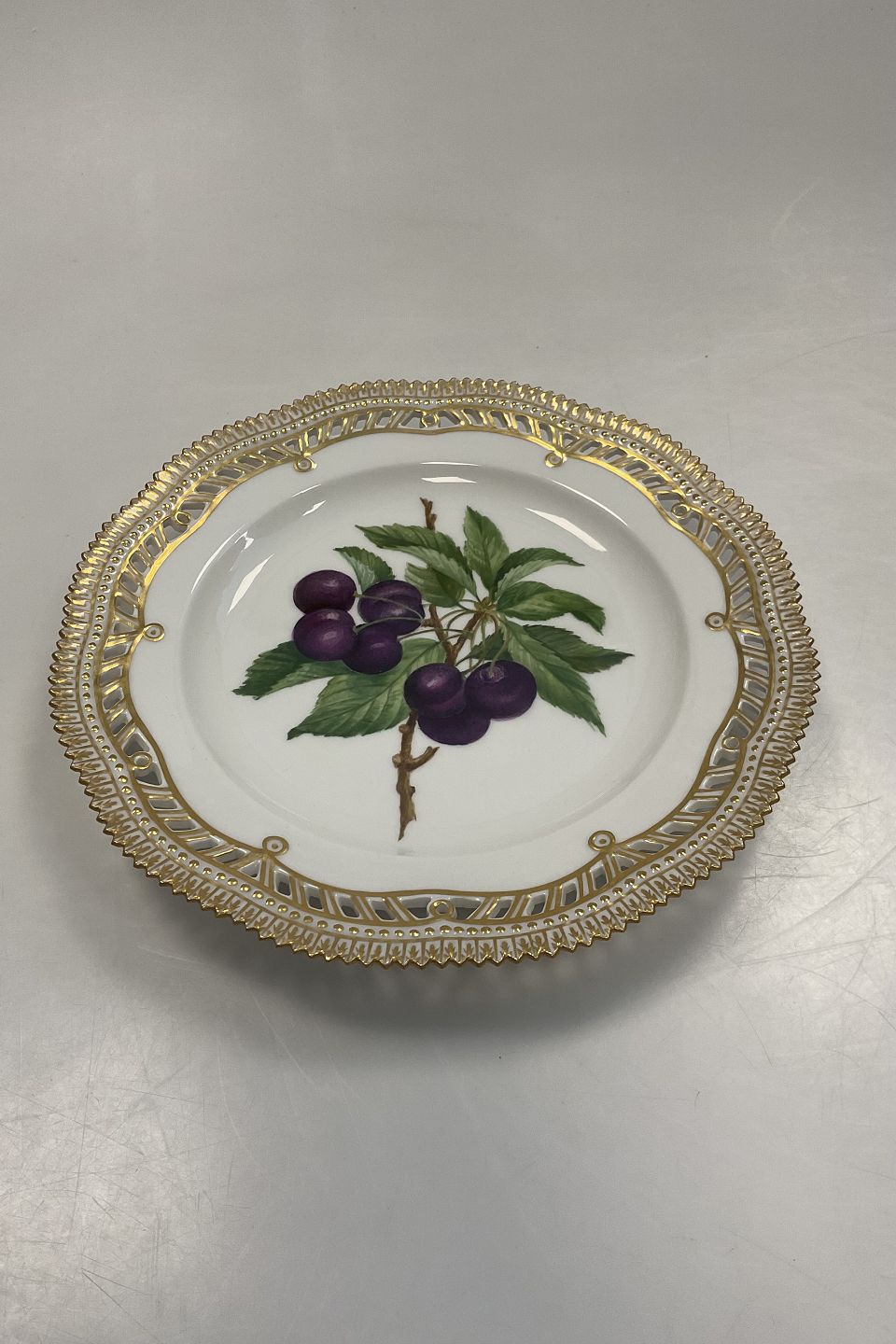 Royal Copenhagen Flora Danica Frugttallerken No. 429/3554. Måler 22,7 cm. (8.93 inch) 1. Sortering. Med gennembrudt kant.
