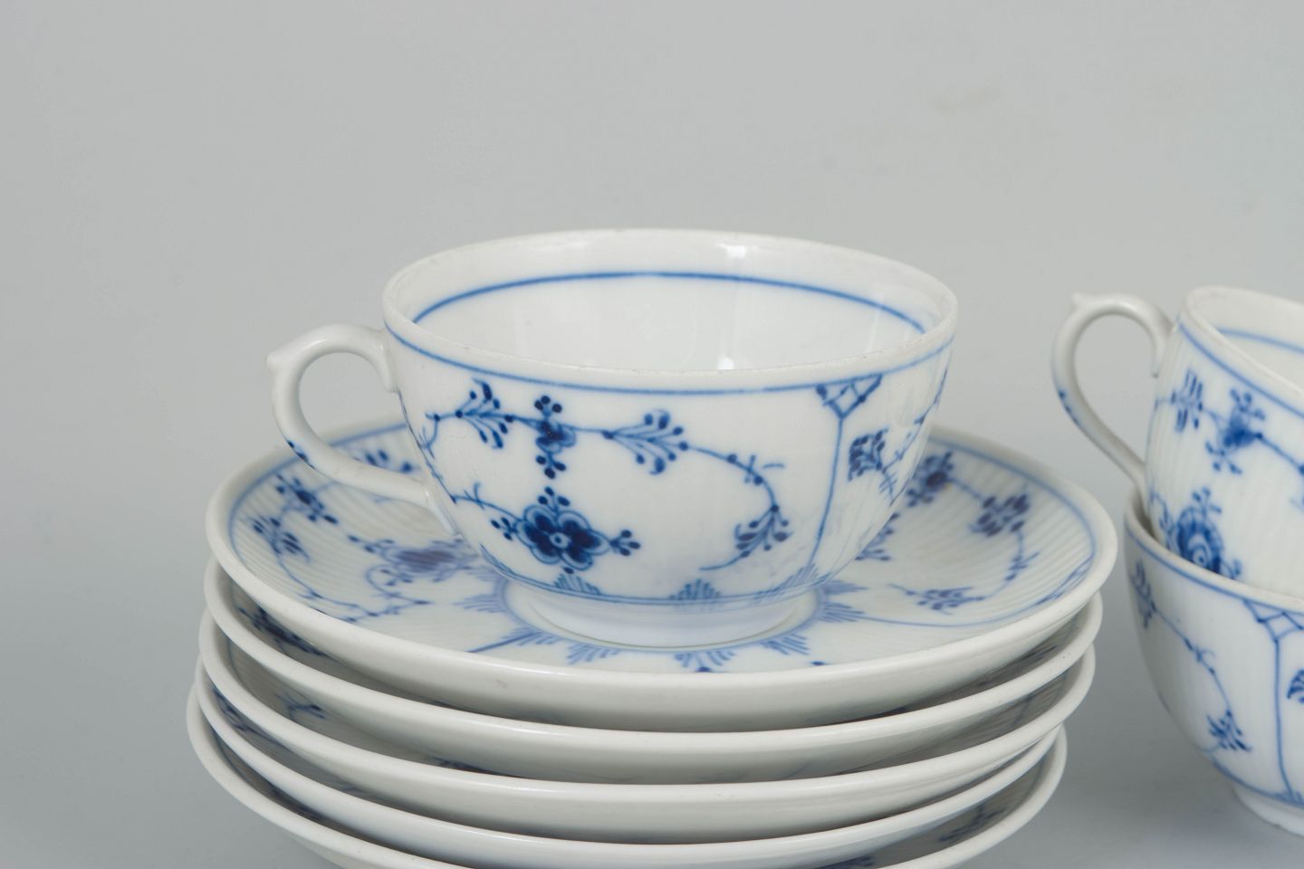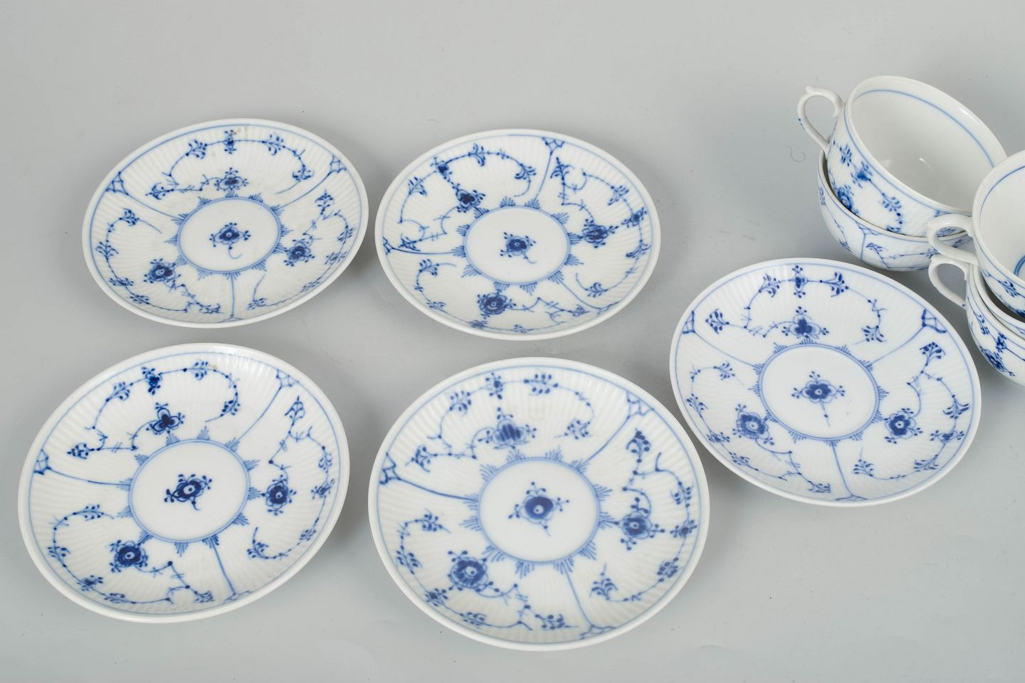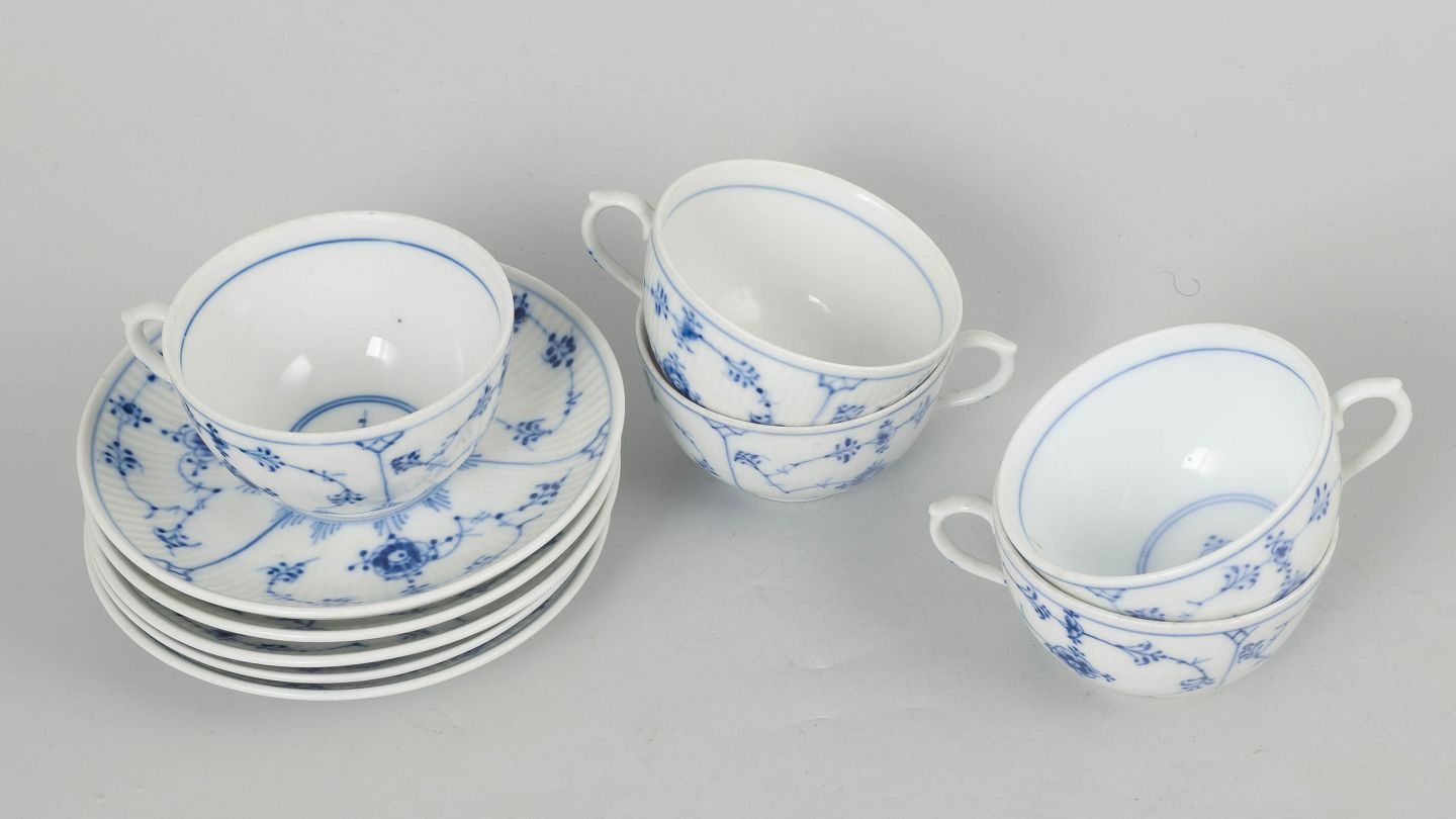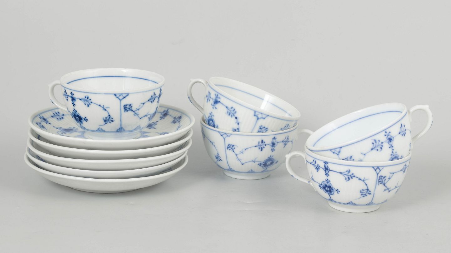 Royal Copenhagen Musselmalet Riflet, sæt af fem kaffekopper med underkopper.Beschreibung: