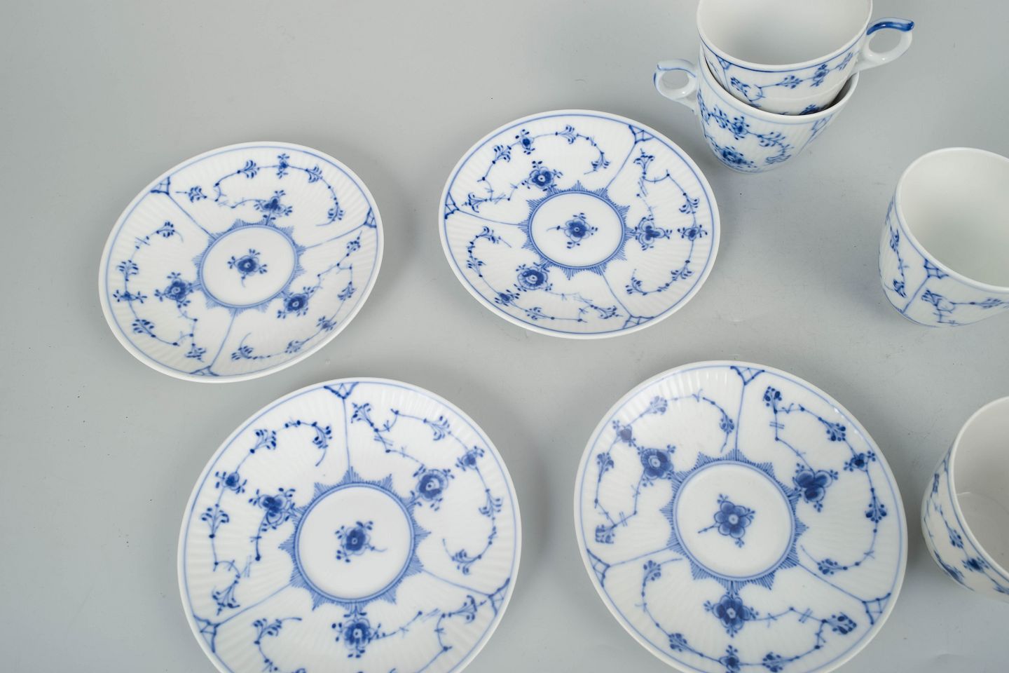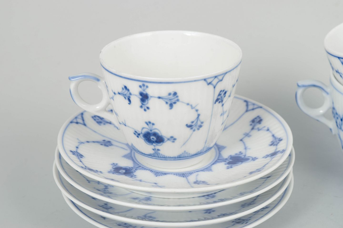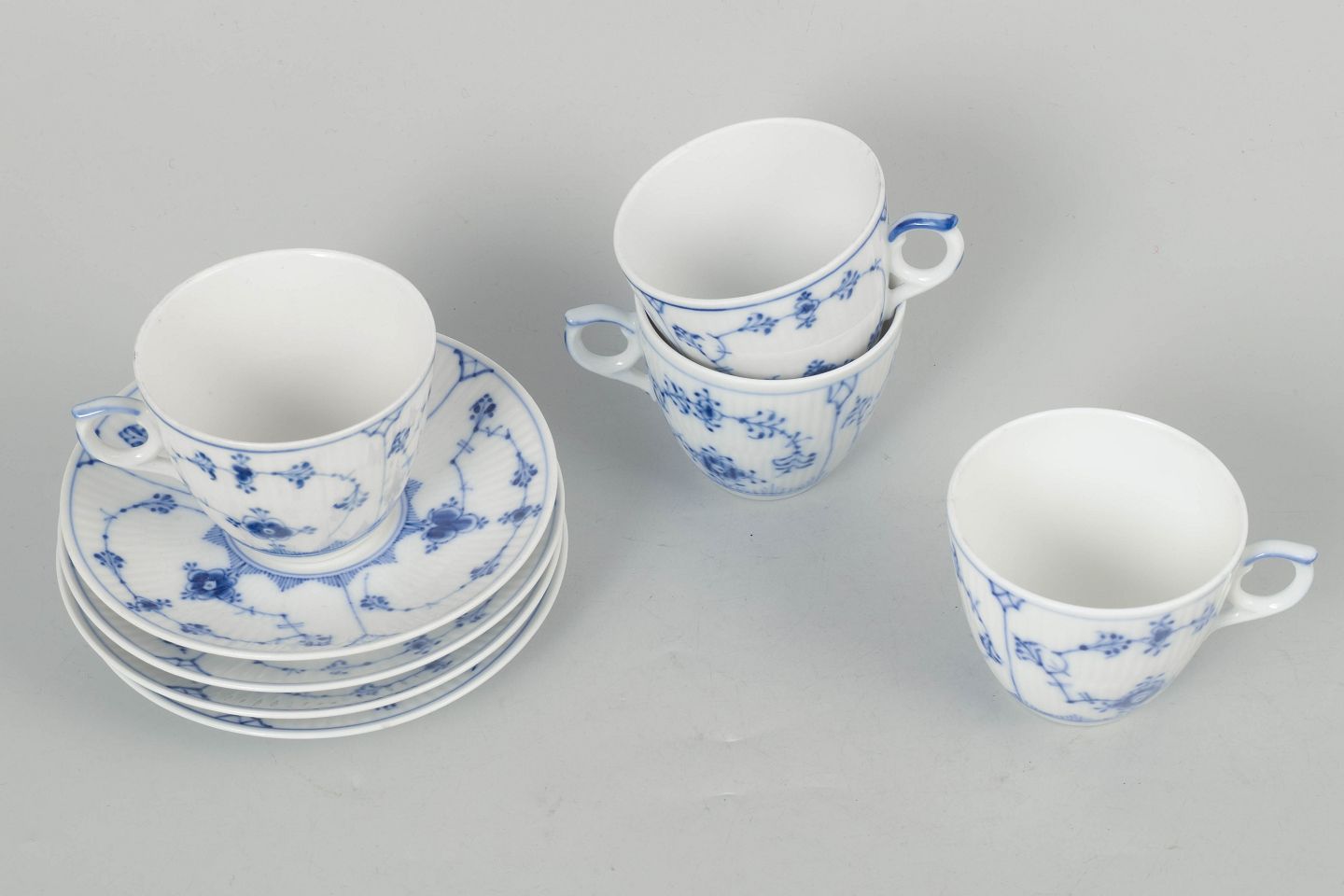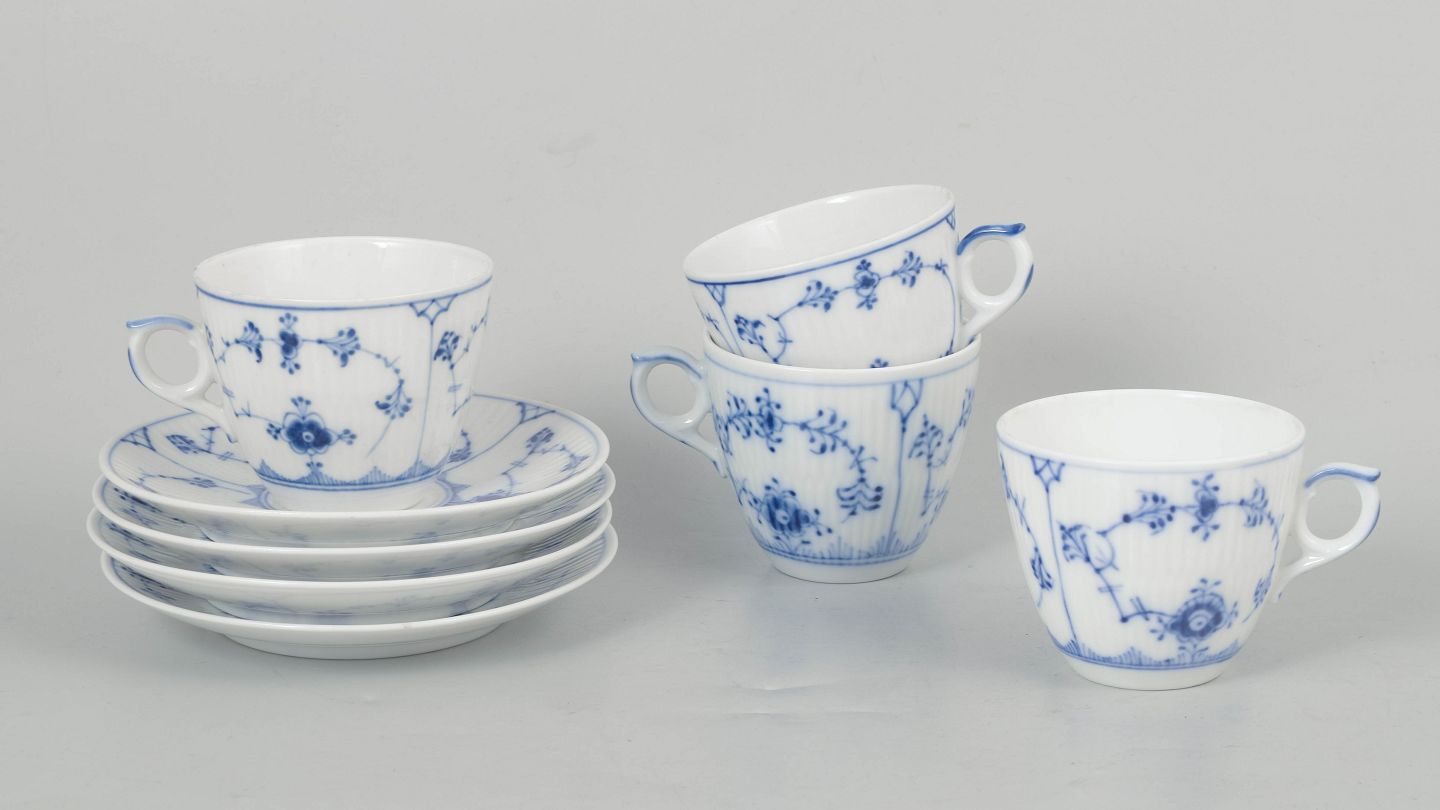 Royal Copenhagen Musselmalet Riflet, sæt af fire kaffekopper med underkopper.Beschreibung: