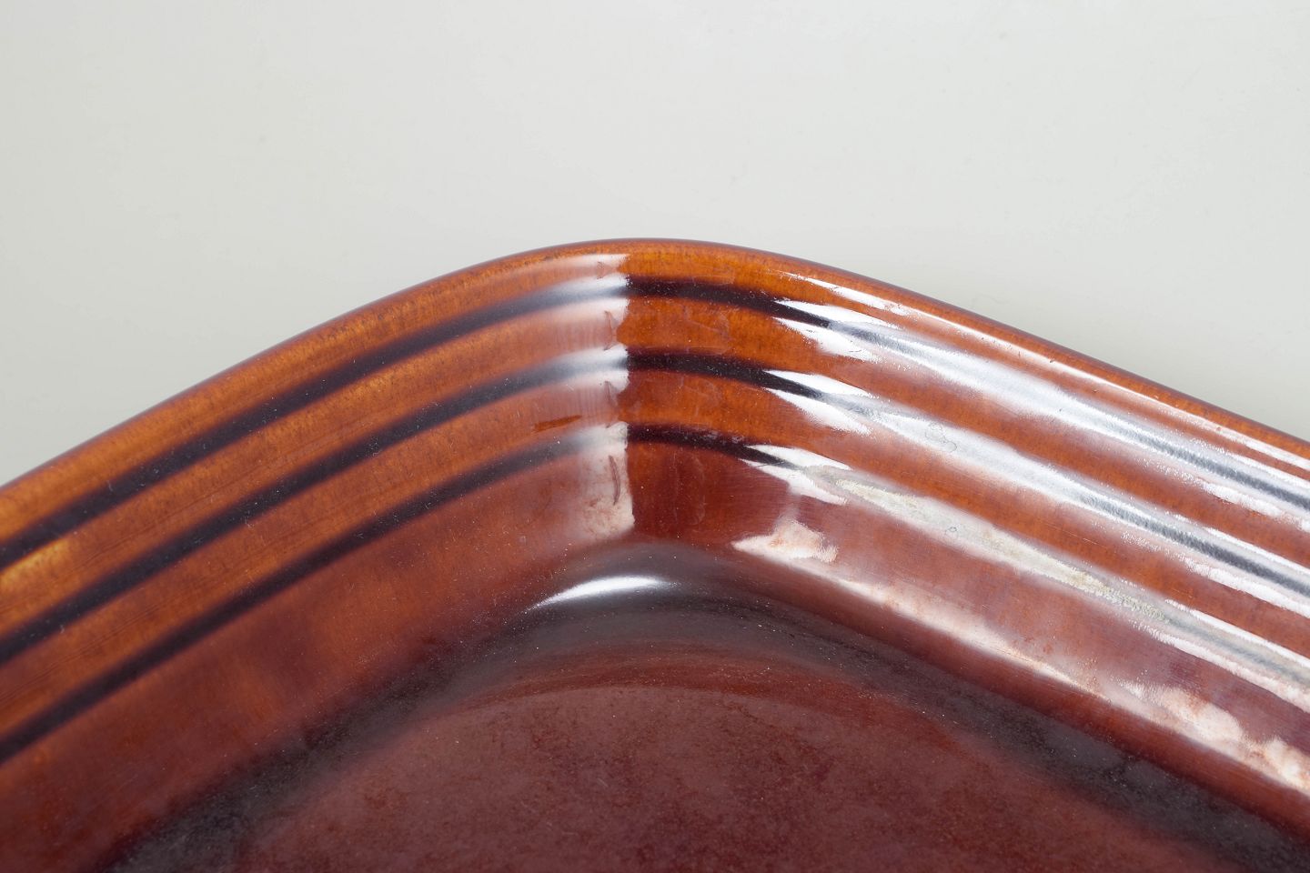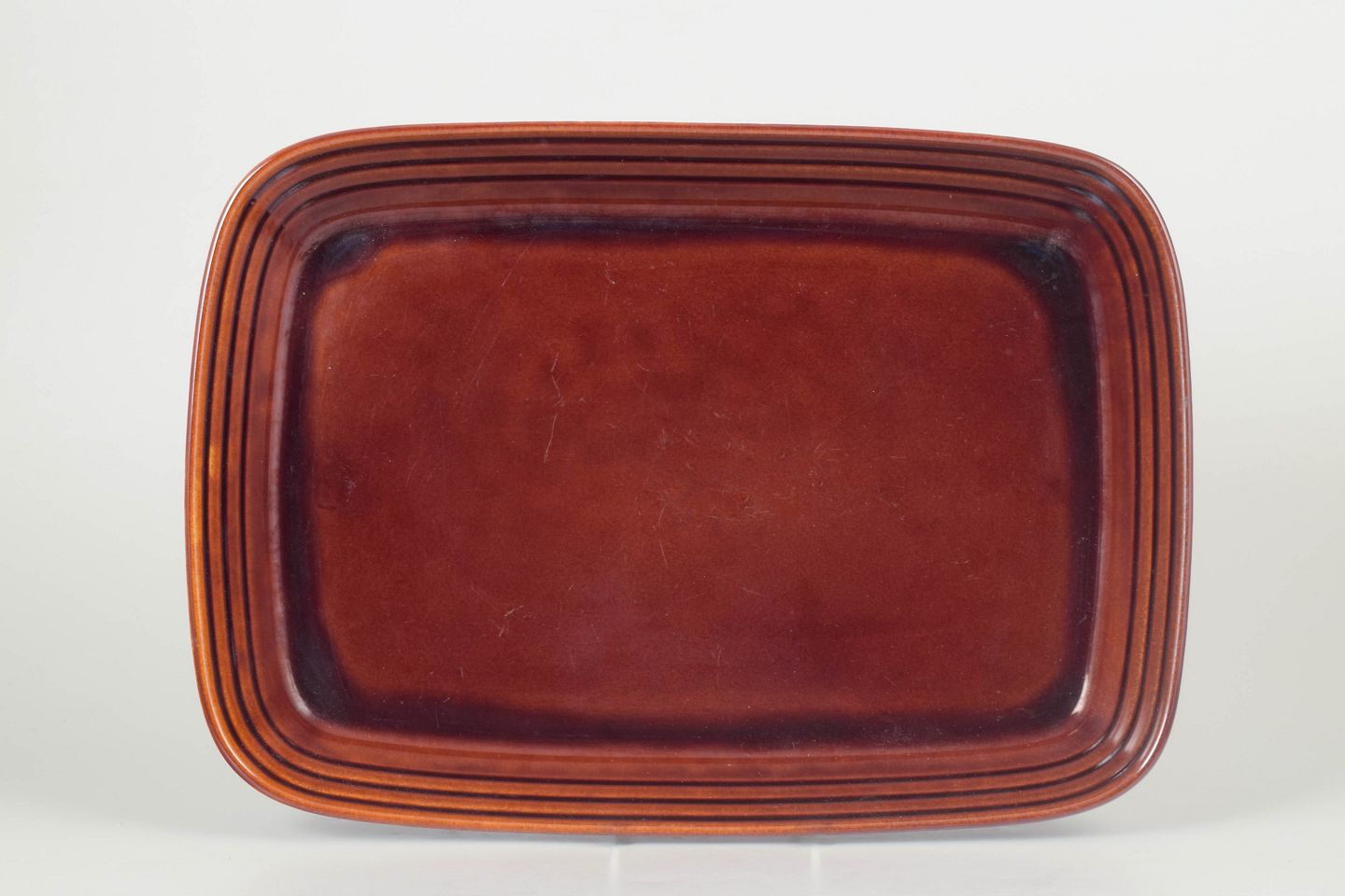 Britt-Louise Sundell for Gustavsberg, stort "Rustik" fad.Stort rektangulært serveringsfad i stentøj fra Rustik-serien med varm brun glasur og karakteristisk rillet kant. Model formgivet i 1970’erne med funktionelt og tidløst svensk formsprog.