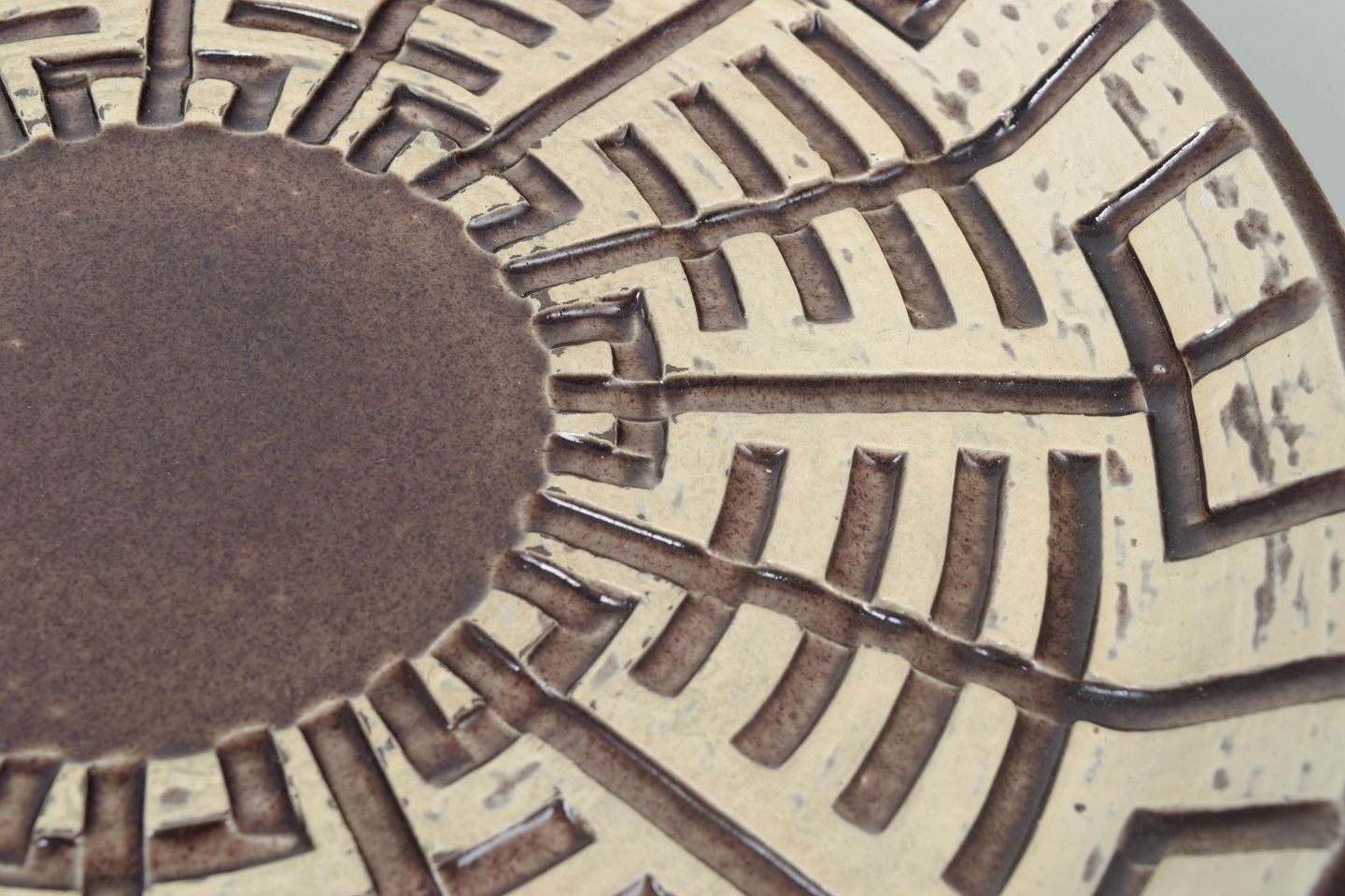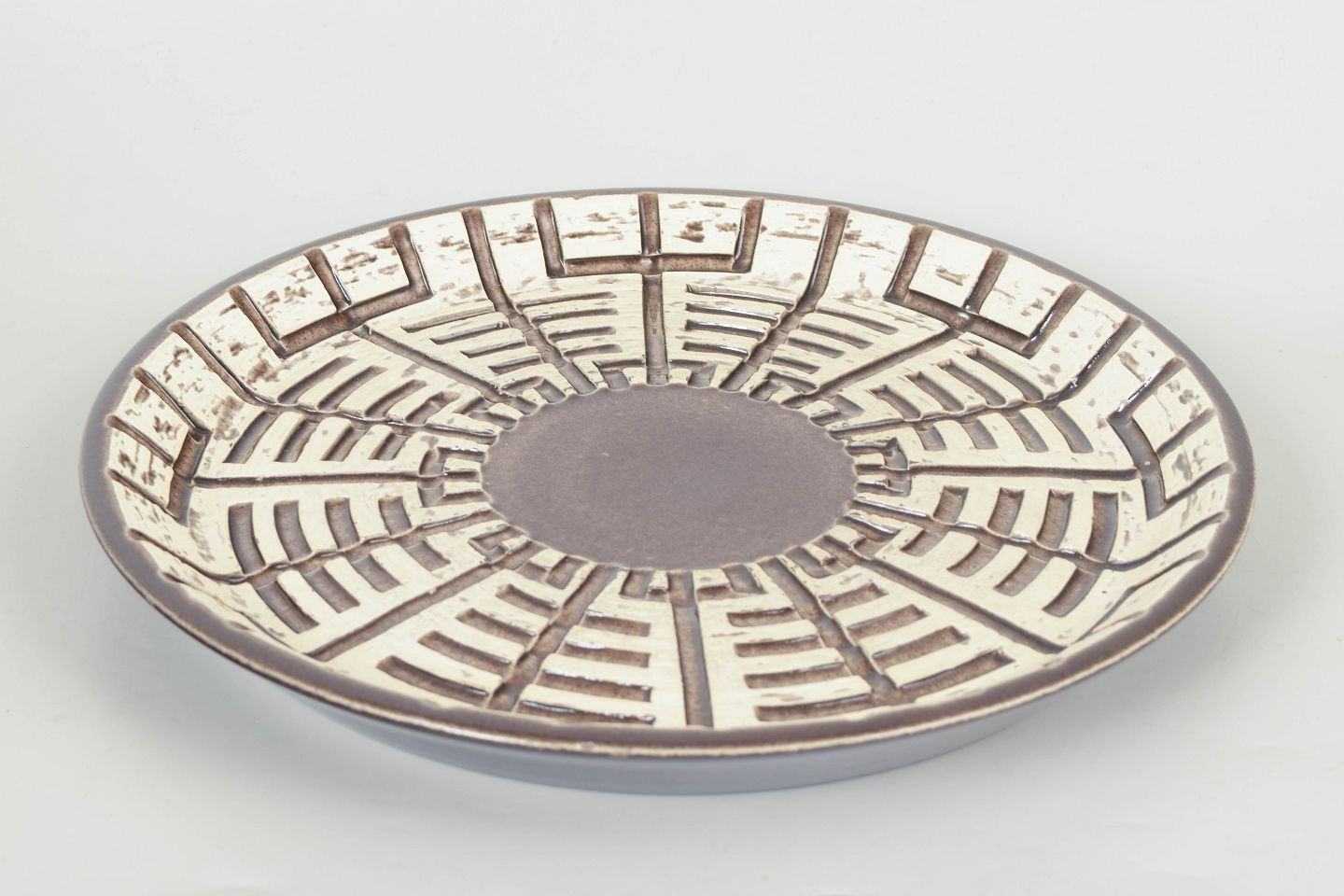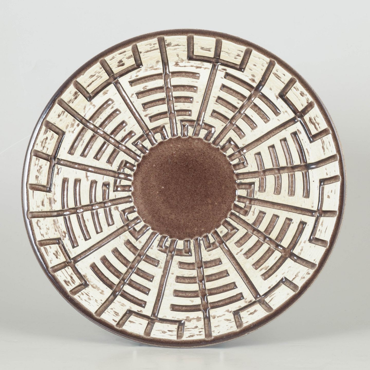 Mari Simmulson for Upsala Ekeby, fad.Stort rundt keramikfad model 5016M med grafisk reliefdekoration i geometrisk mønster og håndglaserede nuancer i brun og cremehvid.