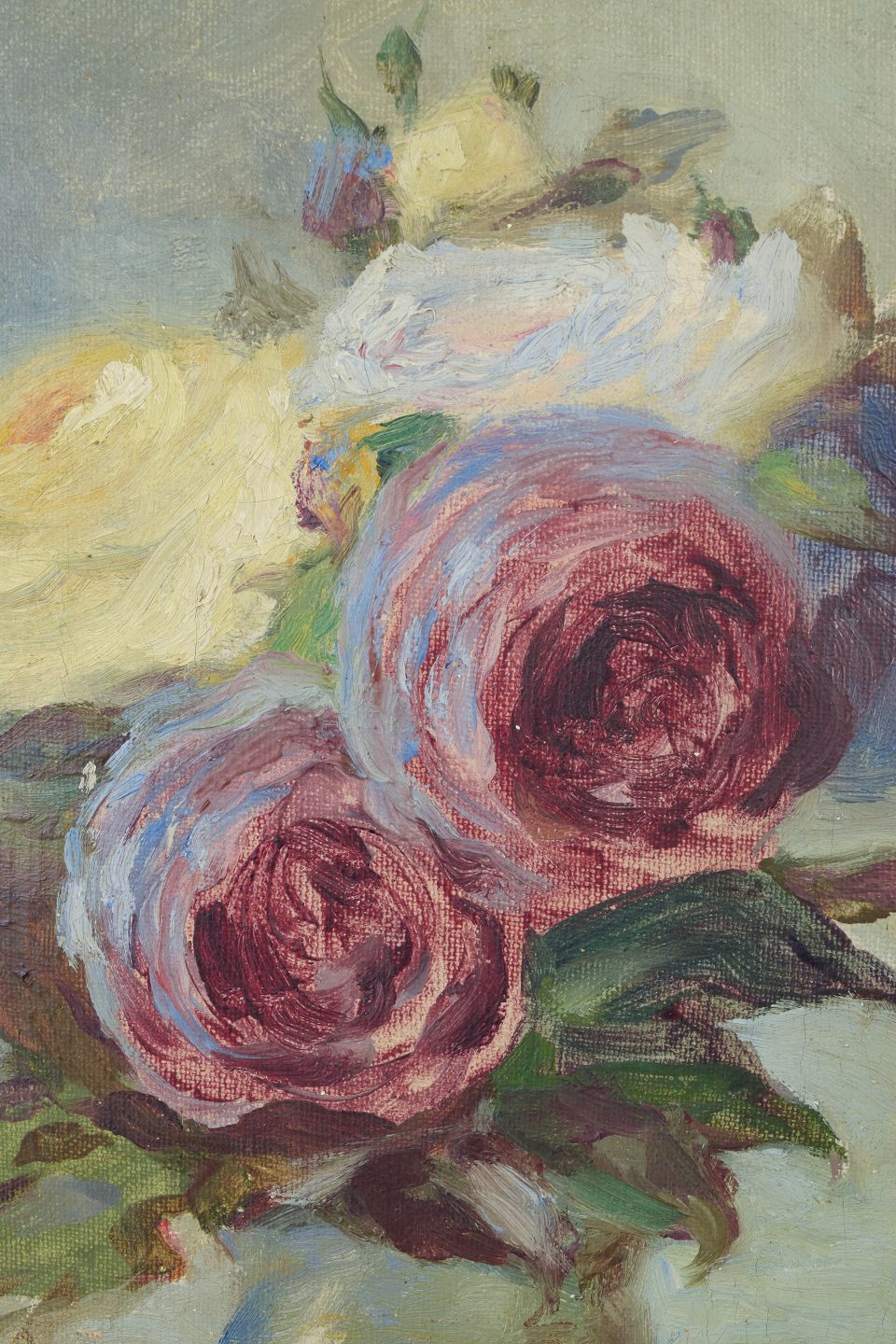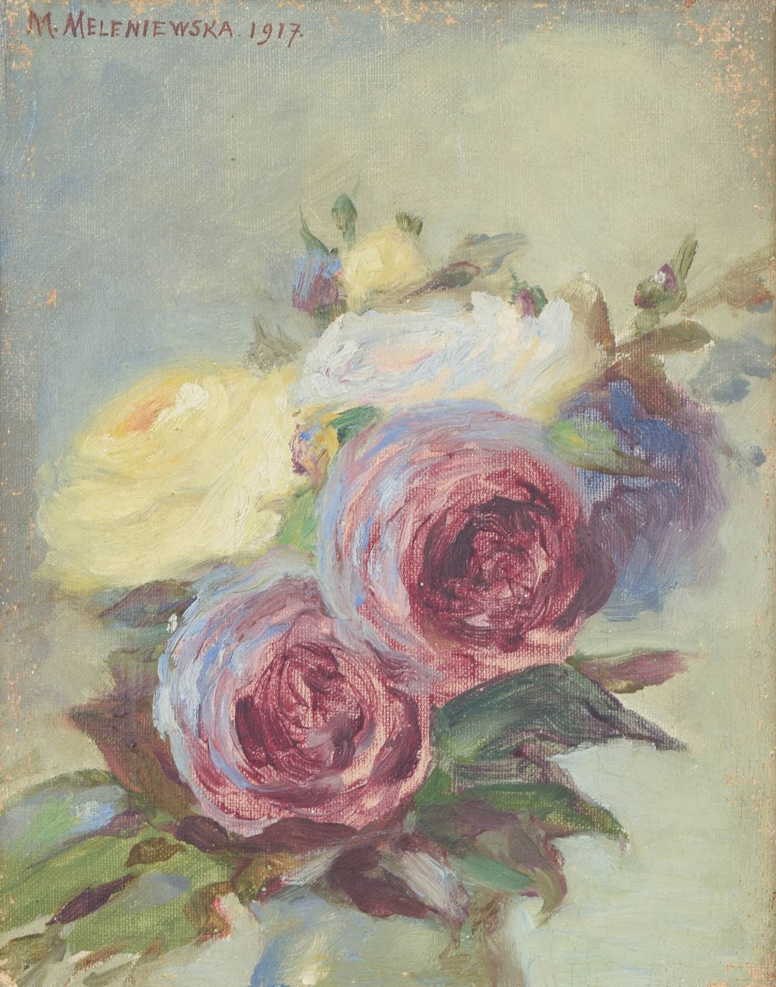 Matilda Meleniewska, oliemaleri, listet polsk billedkunstner.Delikat blomsterstilleben med roser udført i olie på lærred, signeret og dateret 1917, med blød koloristisk penselføring og klassisk sen-impressionistisk atmosfære.