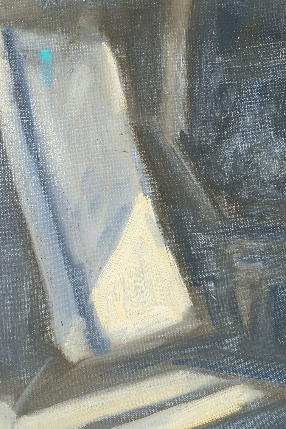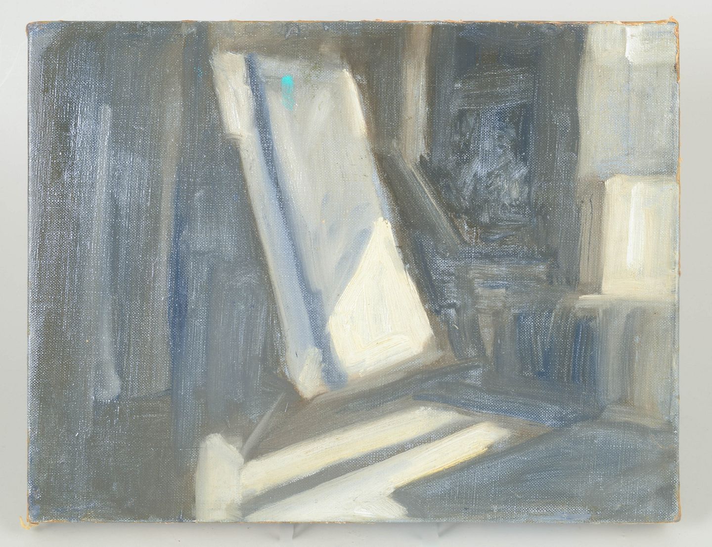 Robert Ladou, olie på lærred, fransk kunstner.Abstrakt modernistisk komposition udført i dæmpede grå, blå og lyse toner med geometriske og arkitektoniske former. Usigneret værk med raffineret kompositorisk balance og tydelig inspiration fra efterkrigstidens franske abstraktion.