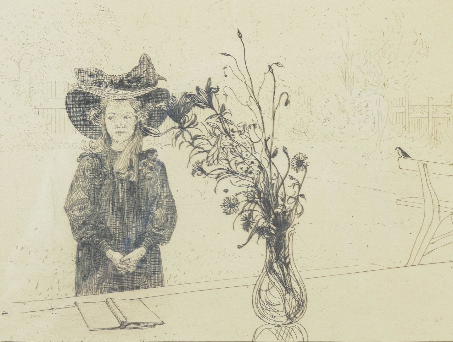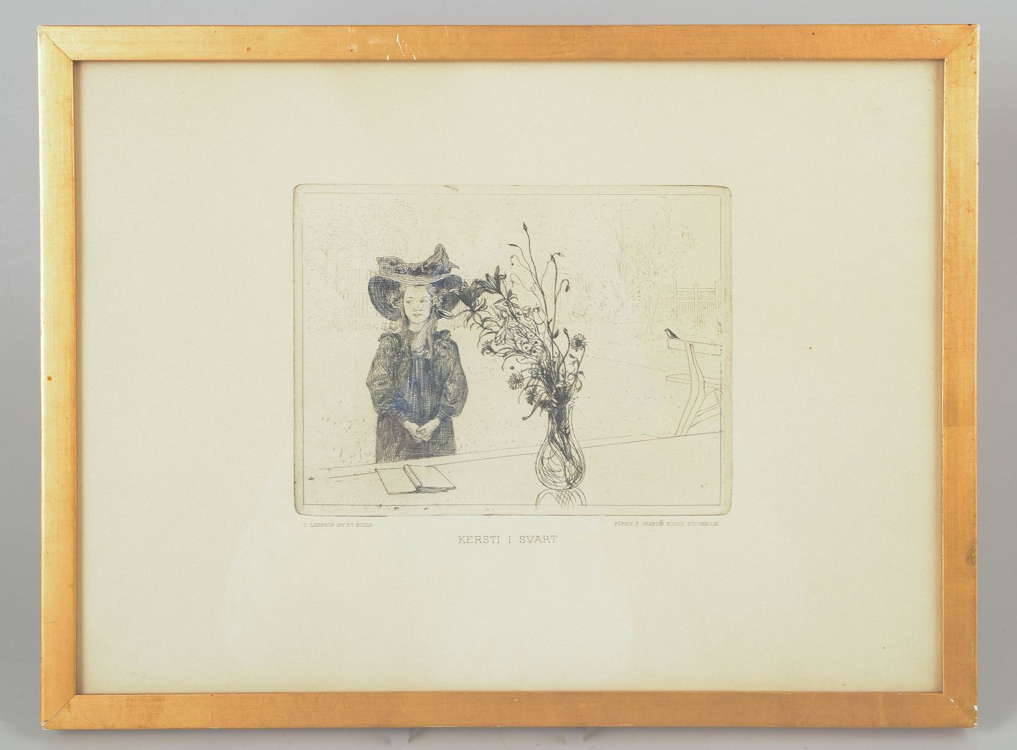Carl Larsson, radering, listet svensk kunstner.“Kersti i svart” med poetisk figurativ komposition, udført som detaljeret radering med portrætteret pige og blomsteropstilling i interiør.