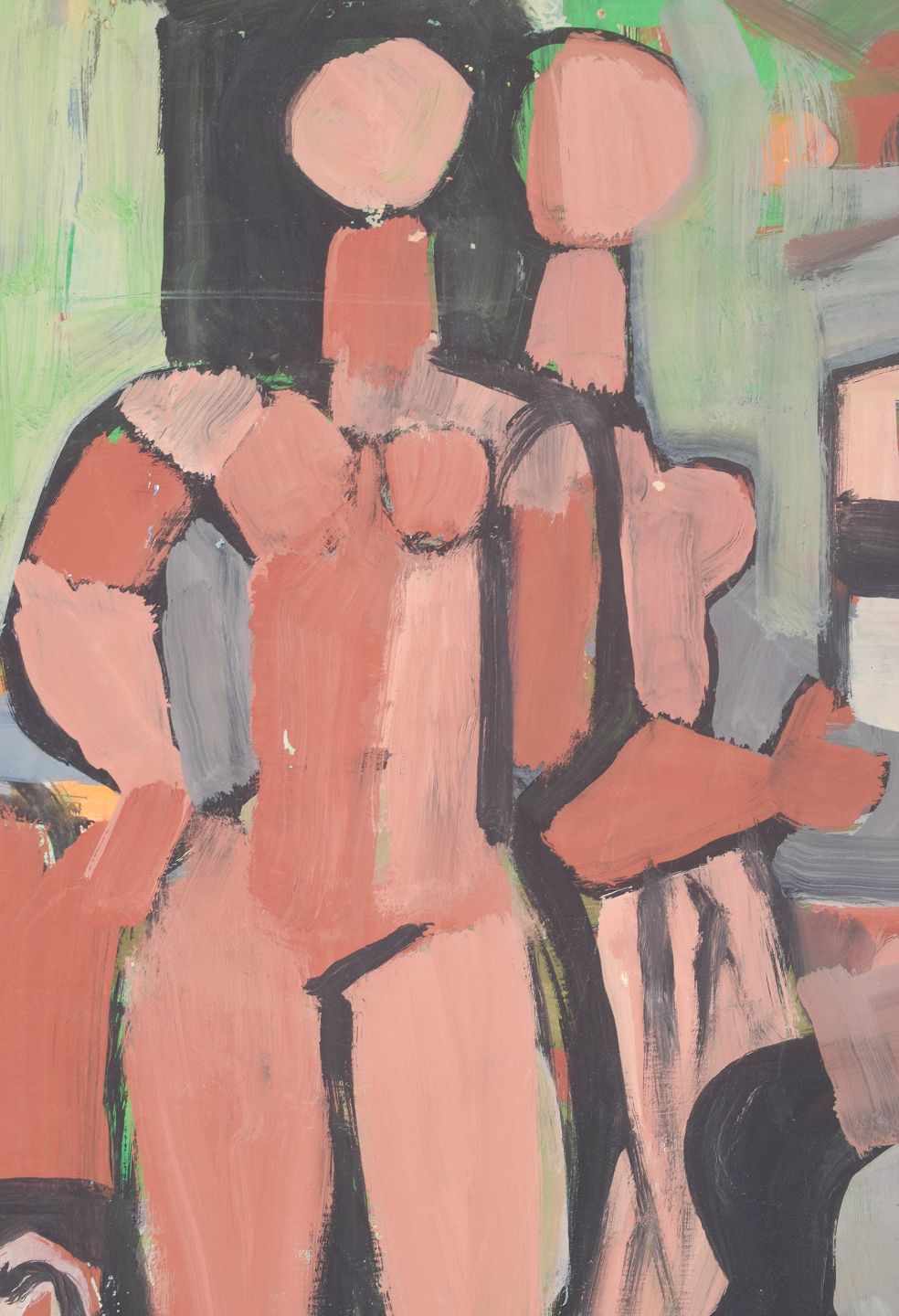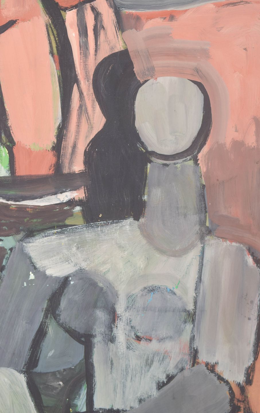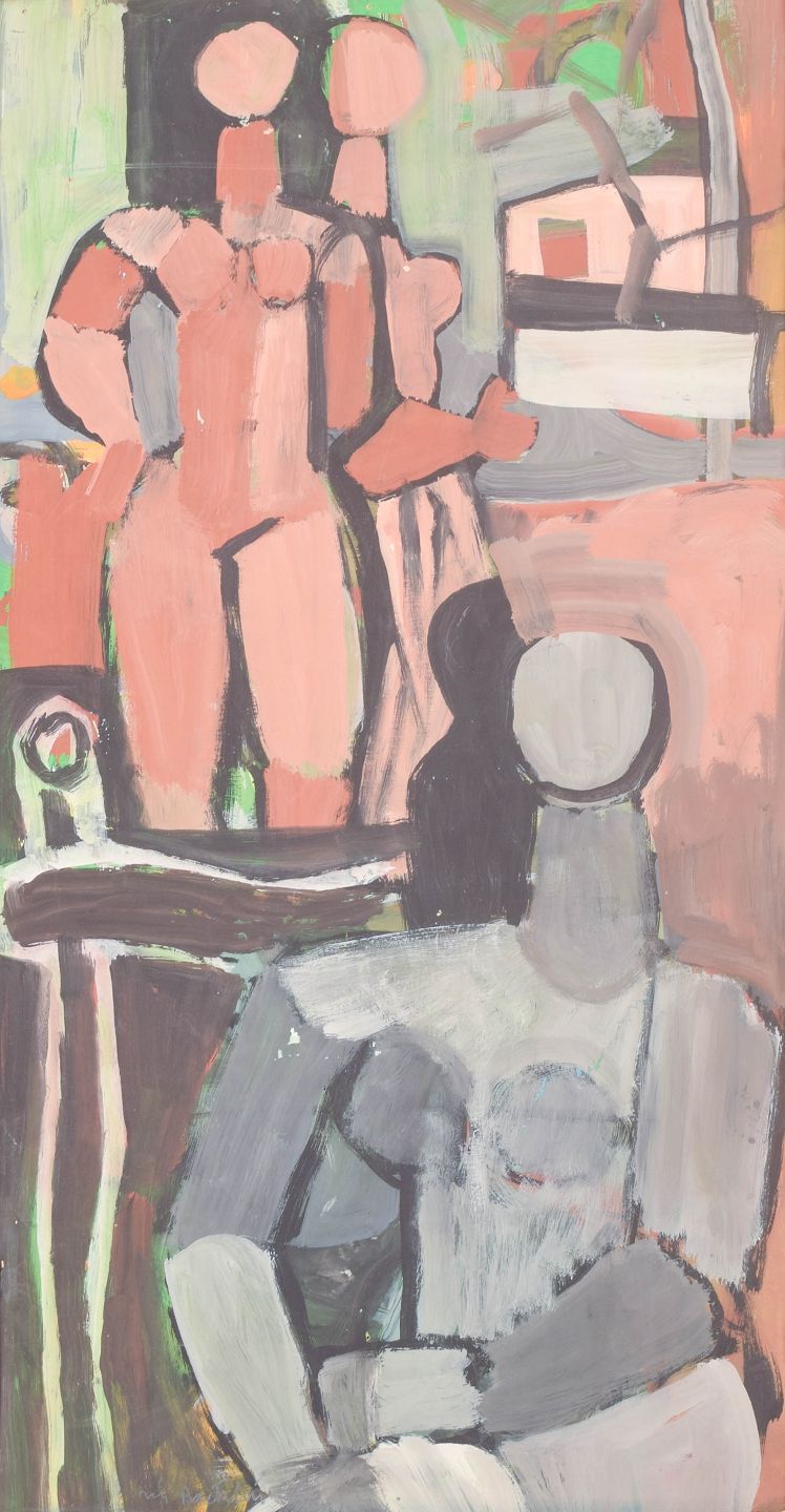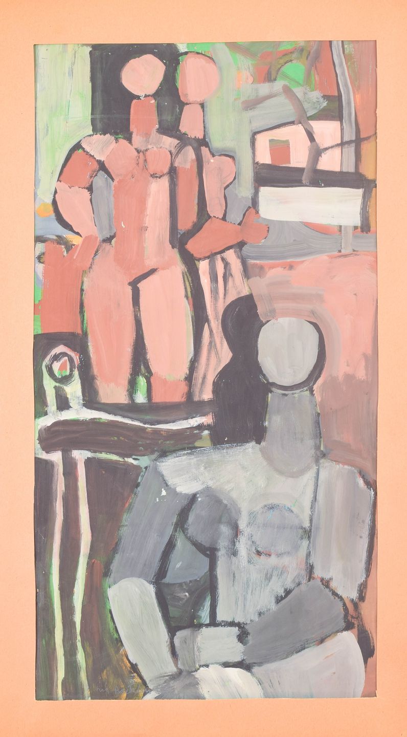 Nils Bäcklin, olie på papir, listet svensk billedkunstner.Modernistisk figurativ komposition med abstraherede menneskefigurer og interiørelementer udført i ekspressiv farveholdning, malet i olie på papir.