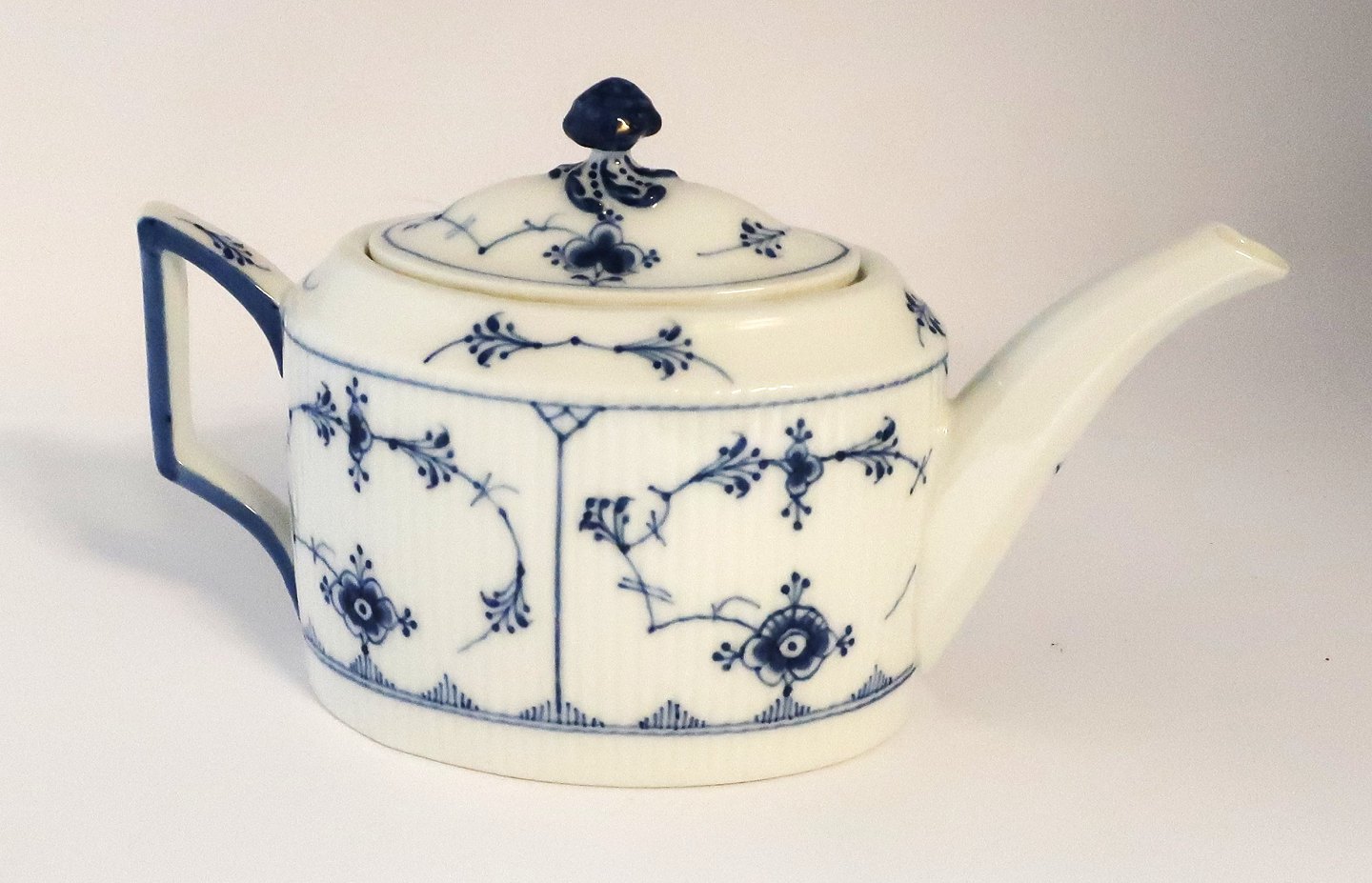 Königliches Kopenhagen. Musselmalet, Gerippt. Teekanne. Modell 253. Höhe 13 cm. Länge 22 cm. (2. Wahl). Hergestellt vor 1923.