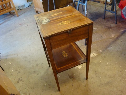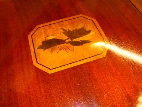 Der Tisch hatte einen Wasserschaden auf der Oberseite der Platte und an den Klappen. Wir haben den Tisch restauriert und neue Intarsien eingelegt. Siehe Foto vor und nach.