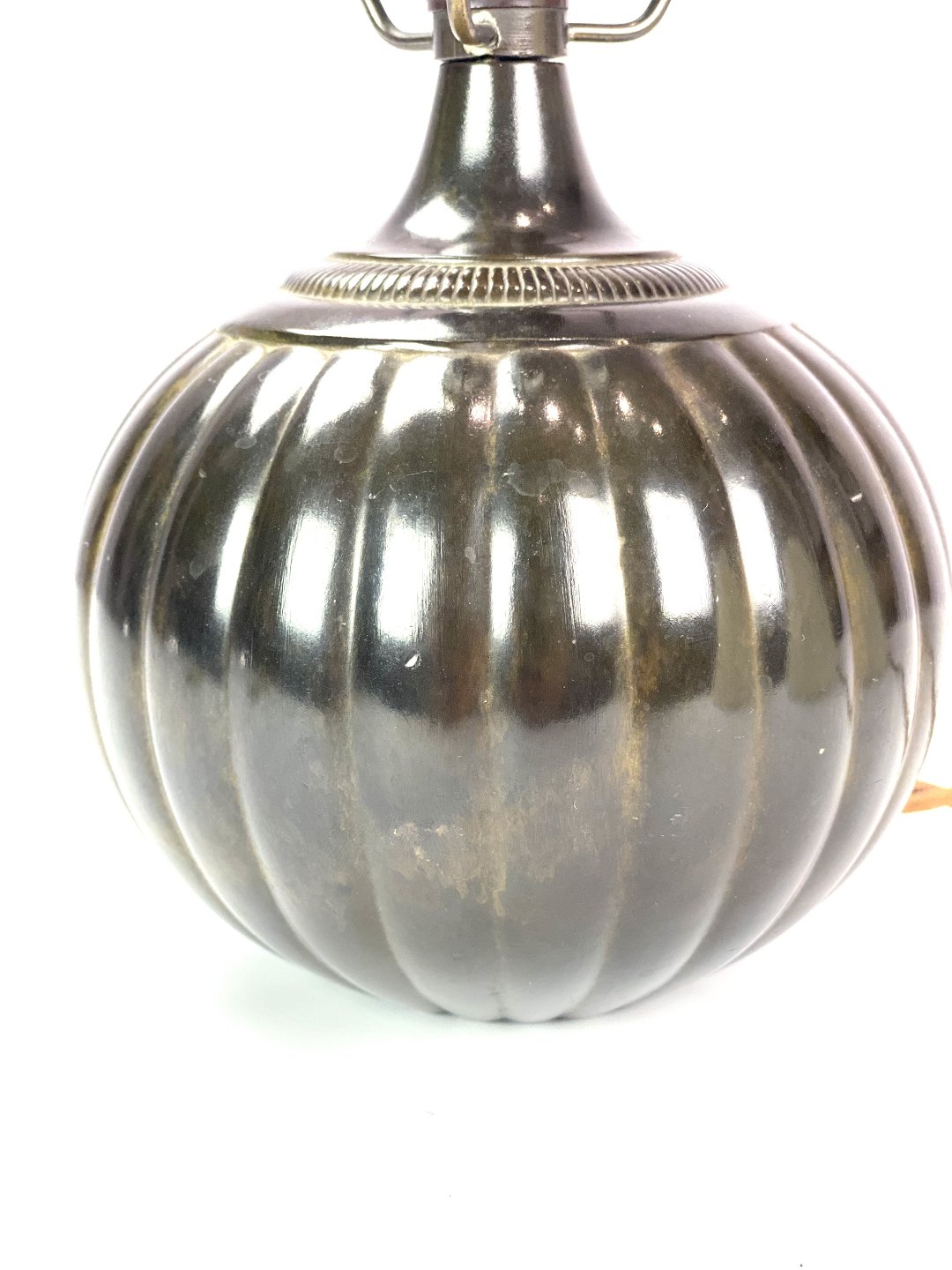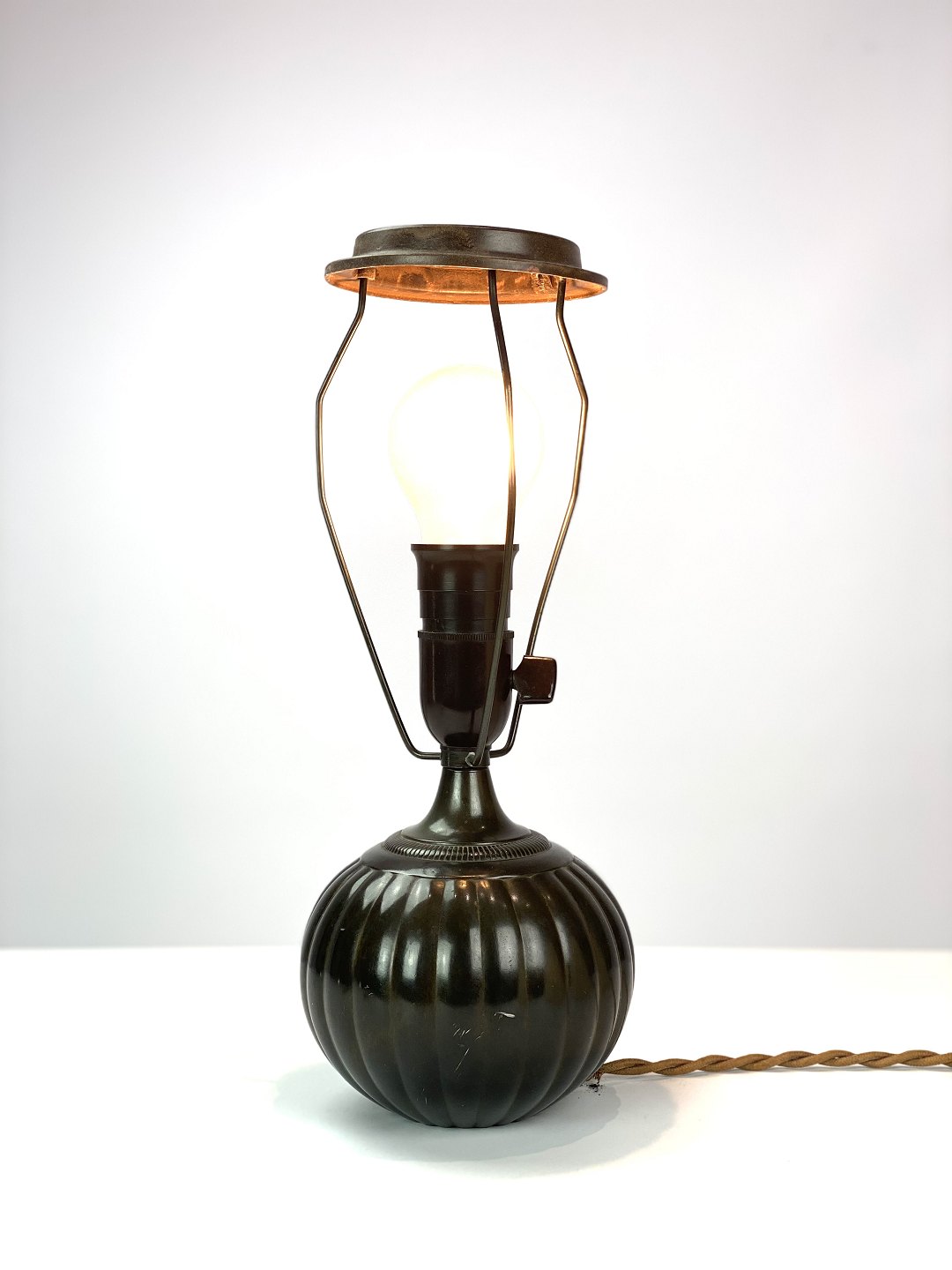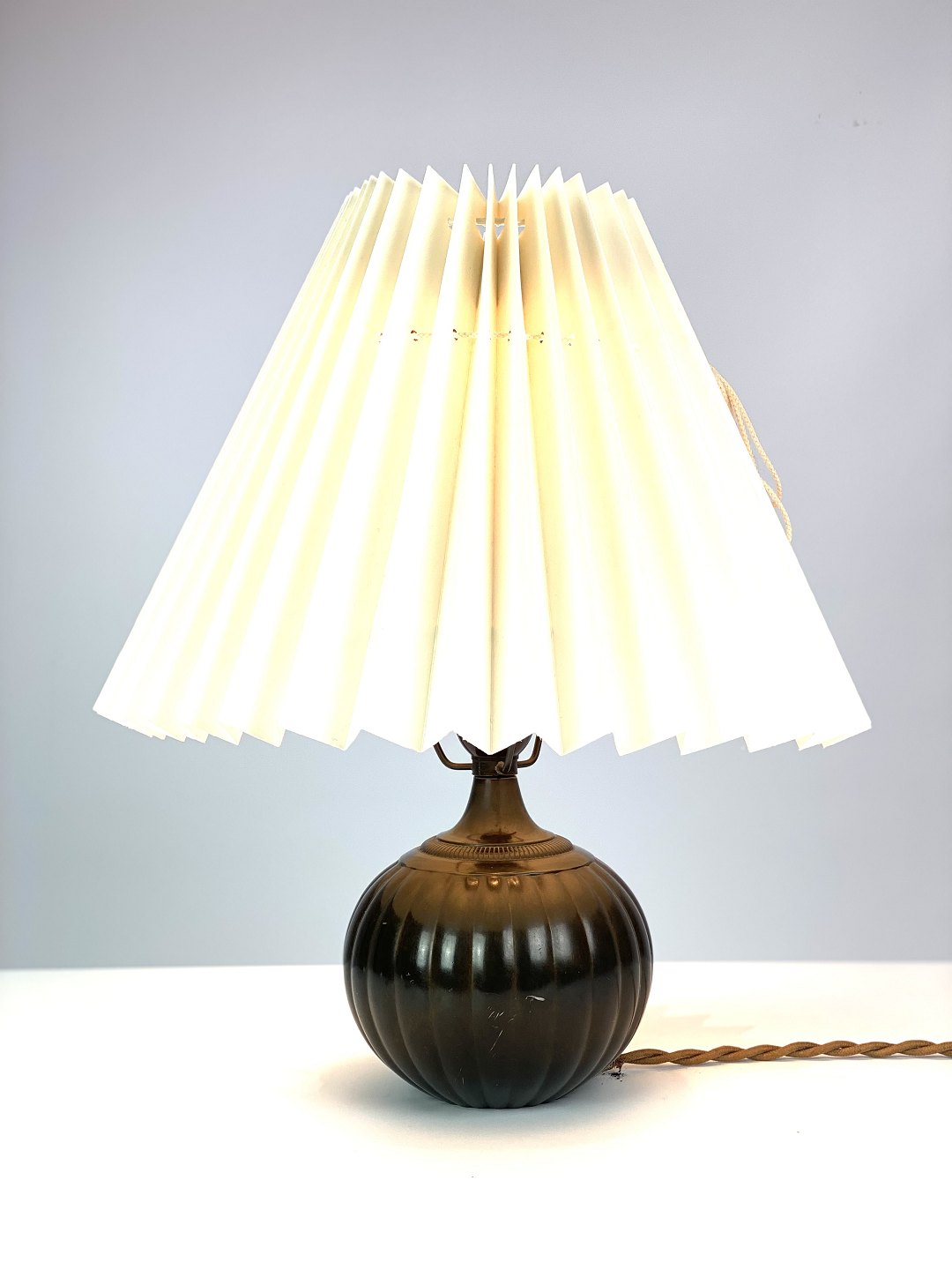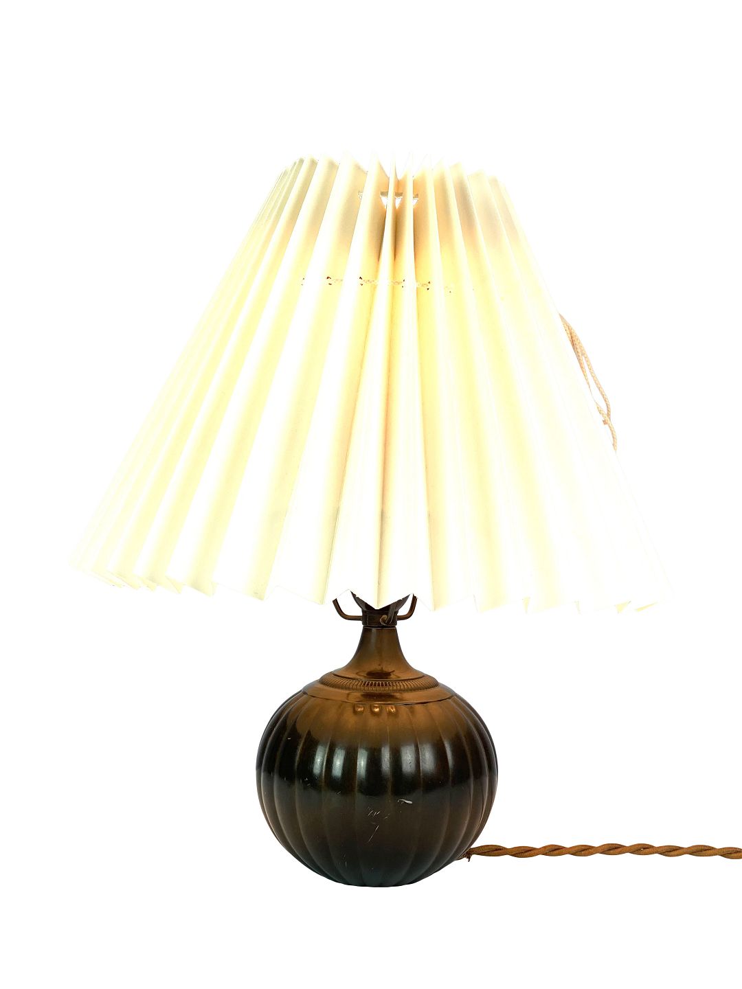 Tischlampe aus Diskometall von Just Andersen. Die Lampe befindet sich in sehr gutem Vintage-Zustand und mit einem Papierschirm.