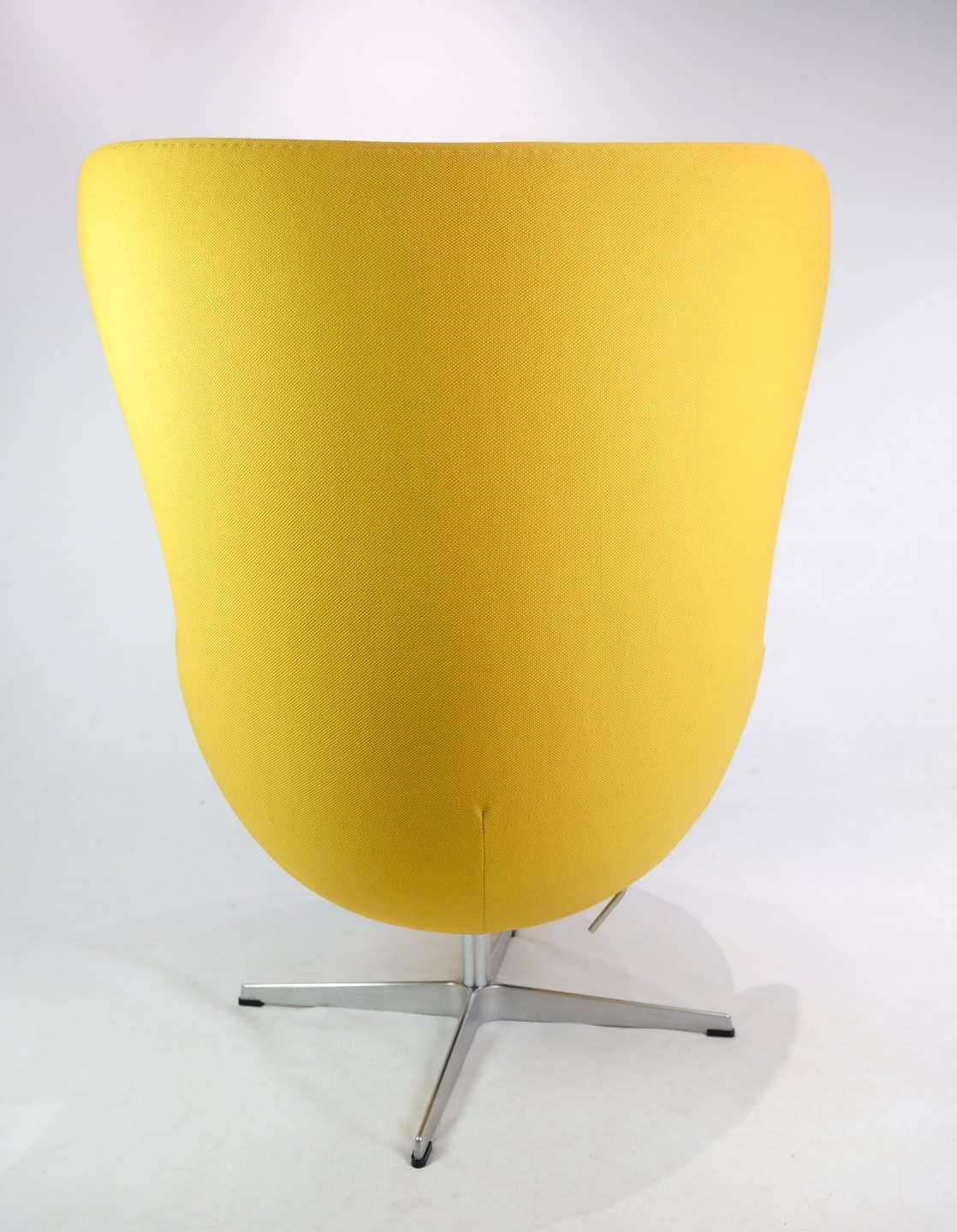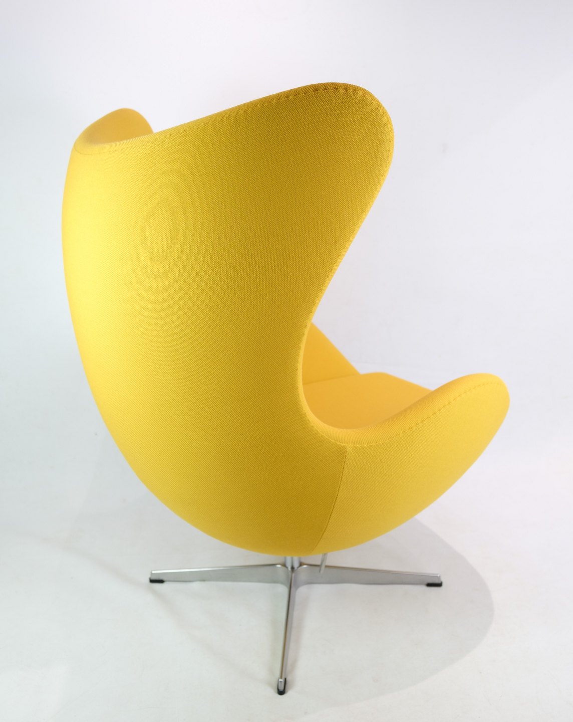 Wir haben eine sehr schöne Neupolsterung des Egg in einem currygelben Stoff von höchster Qualität vorgenommen. The Egg ist ein ikonischer Sessel, Modell 3316, entworfen vom berühmten dänischen Architekten und Designer Arne Jacobsen und hergestellt von Fritz Hansen. Der neue Stoff verleiht dem Sessel ein frisches und modernes Aussehen und bringt ihn auf den heutigen Stand in Bezug auf Stil.