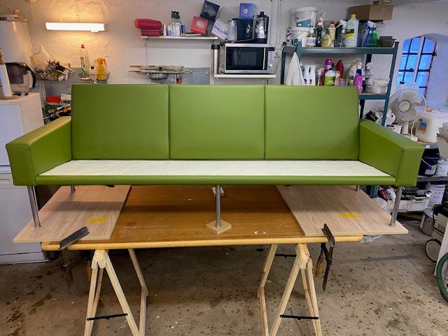 Der Stuhl wurde verkauft und anschließend von unseren eigenen Polsterern in grünem Leder von höchster Qualität neu gepolstert.