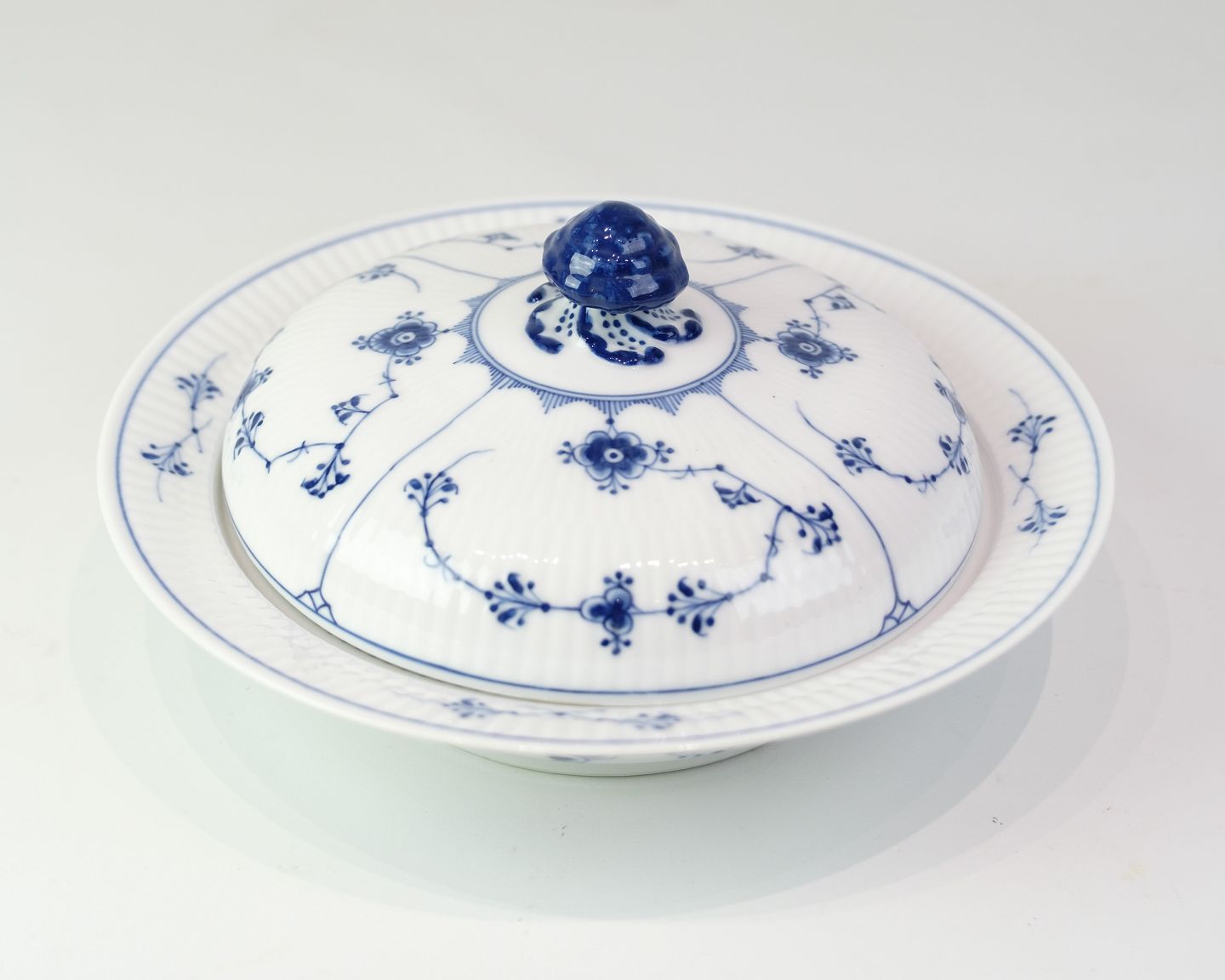 Elegante Deckelschale von Royal Copenhagen im klassischen Blaue-Gerappt-Dekor. Das Modell ist Nr. 272 und aus handbemaltem Porzellan mit kobaltblauer Dekoration und feinen gerippten Details gefertigt.