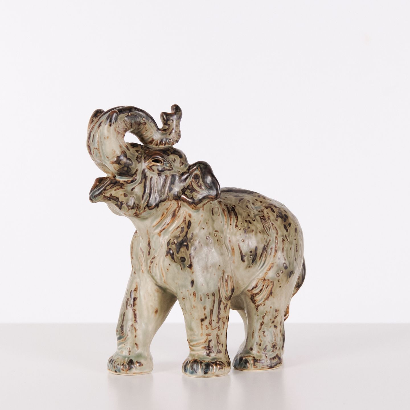 Steinzeugfigur in Form eines stehenden Elefanten, Modell 21517, entworfen von Knud Kyhn für Royal Copenhagen. Die Figur wurde aus Steinzeug gefertigt und gehört zu Knud Kyhns bekannten Tierdarstellungen, die bei Royal Copenhagen vor allem ab den 1930er-Jahren produziert wurden. Kyhns Arbeiten sind für ihre klare Formgebung und materialbetonte Ausführung bekannt und werden von Sammlern dänischer Keramik geschätzt.