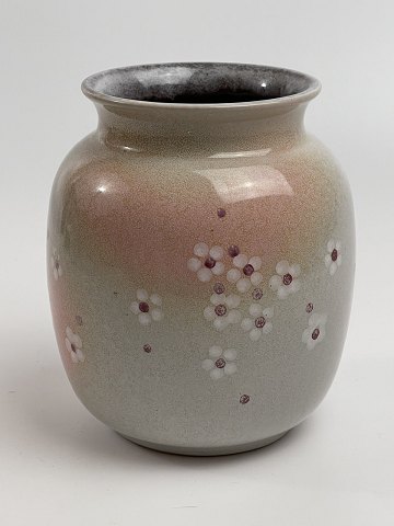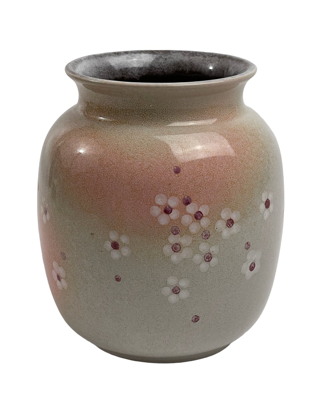 Schöne Keramikvase mit Kirschblüten, beige, rosa von Strehla Keramik, damals DDR