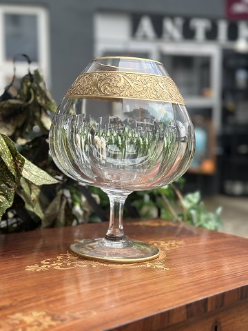 Moser Glaskelch Kristall, sehr hochwertig aus der Mitte des 20. Jahrhunderts, breites Band aus vergoldetem 24 Karat Goldemail mit eingravierten Blumen im klassischen Barock H 18 cm B 10 cm
