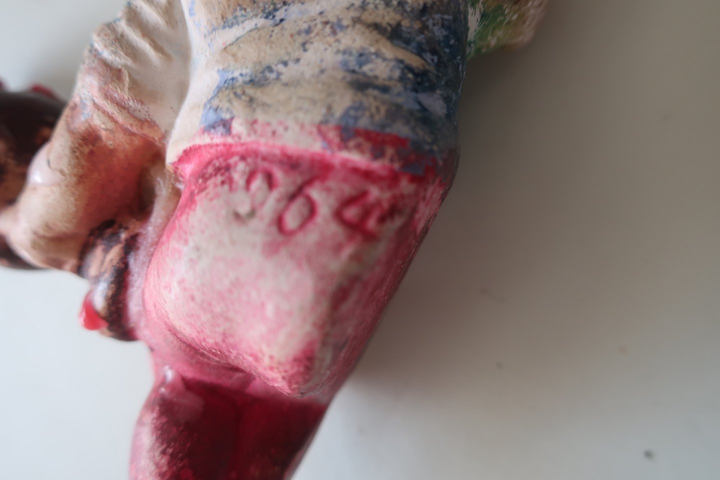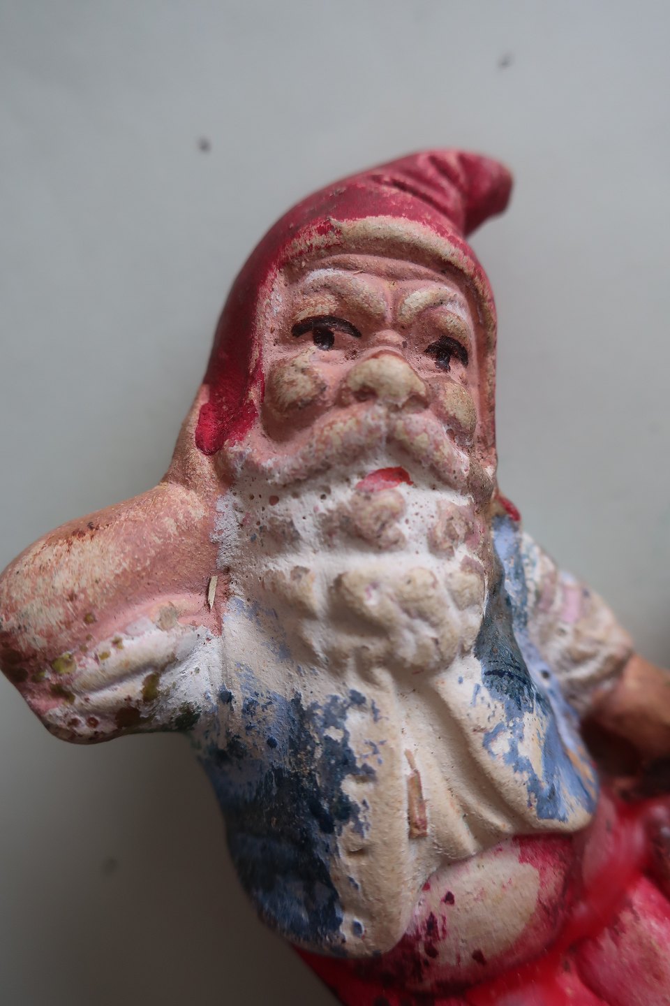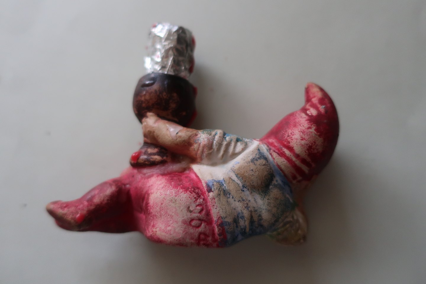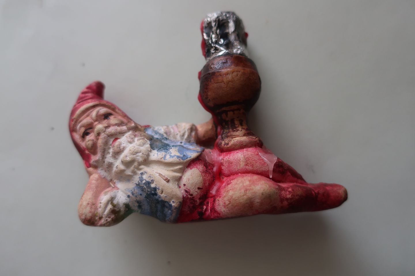 1 gammel nisselysestage til kertelys Liggende nisse Gips og håndmalet H: 5cm B: 10cm Fra 1940-1950'erne Stemplet nr.. 964 på rumpen God stand Varenr.: KH1006